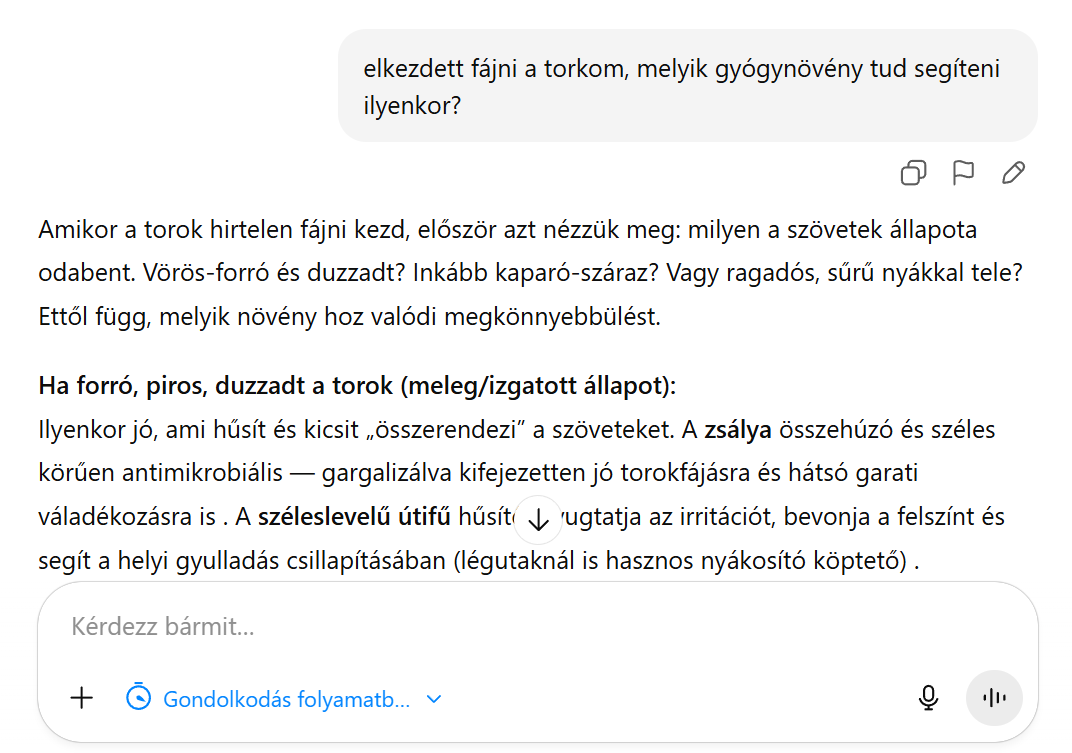 „Szeretnék olyan gyógynövényekről tanulni, amik segítenek az alvásban” Ahelyett, hogy felsorolna 20 altató gyógynövényt, inkább rákérdez az alvási mintáidra, és megtanítja a 2–3 olyat, ami konkrétan neked fog segíteni. Elmagyarázza az elkészítési módokat, az időzítést és azt, honnan tudod, hogy működik-e. Tudást épít, nem csak utasításokat ad.