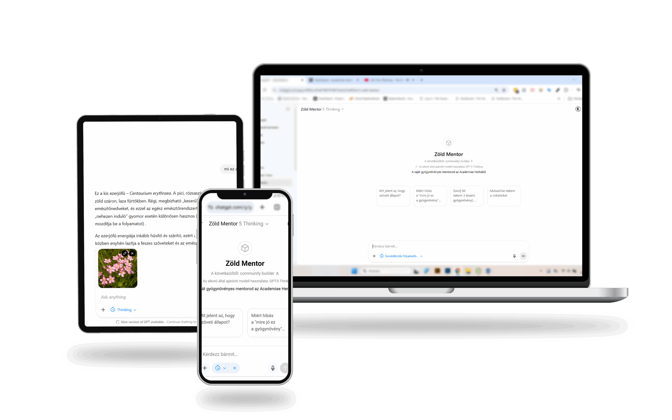 A Zöld Mentor ezzel szemben ellenőrzött forrásokat használ. Minden leckét személyre szab a saját helyzetedhez — figyelembe veszi milyen növényekhez férsz hozzá, a tapasztalati szintedet és a tanulási céljaidat (persze ezt előre el kell mondanod neki). És kifejezetten füvész oktatására készült, strukturált tudásbázissal — nem egy általános chatbot, ami egyszerre próbál foglalkozni költészettel, programozással és minden mással.